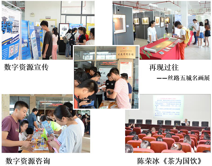 12日下午开幕式活动十分丰富, 16家数字资源商在图书馆宣传并解答读者们的各类咨询;“再现过往”——丝路五城名画展,吸引了同学们驻足品味观赏;逸夫讲坛邀请了国家一级评茶师为题开讲。