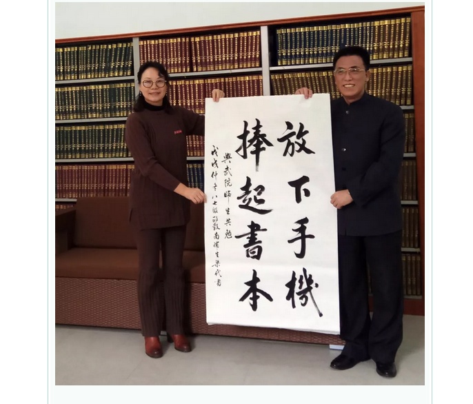 12月16日上午,我校1987级政教专业毕业生,文学(书法)博士梁代(原名梁新颖,福建浦城人)向学校图书馆捐赠个人专著《康有为书法研究》(由人民出版社出版),并留下墨宝“放下手机,捧起书本”,勉励师生。同时梁代表示将精心挑选一批价值十万元图书捐给学校。徐俐华馆长接受了赠书并授予收藏证书。