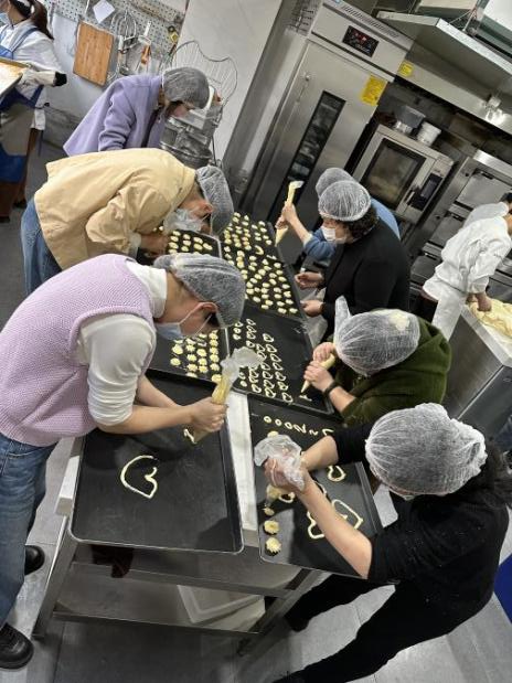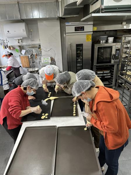 本次活动包含水果蛋糕与曲奇饼的制作。女教职工们先参观了面包工坊,之后在杜氏面包屋工作人员的引导下,分两个场地同时进行DIY活动。