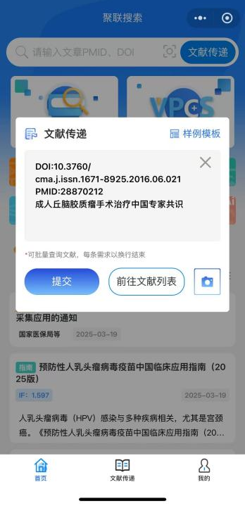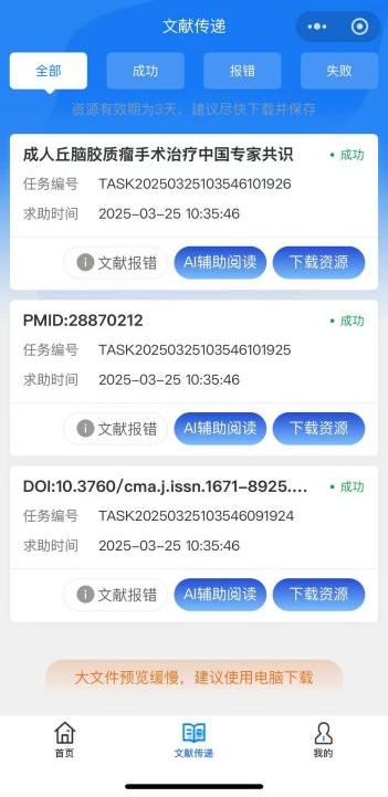 点击首页顶部搜索栏,输入文献DOI/PMID/文献标题等信息(如“肿瘤免疫治疗”),查看任务状态,已成功文献支持下载和AI辅助阅读;
