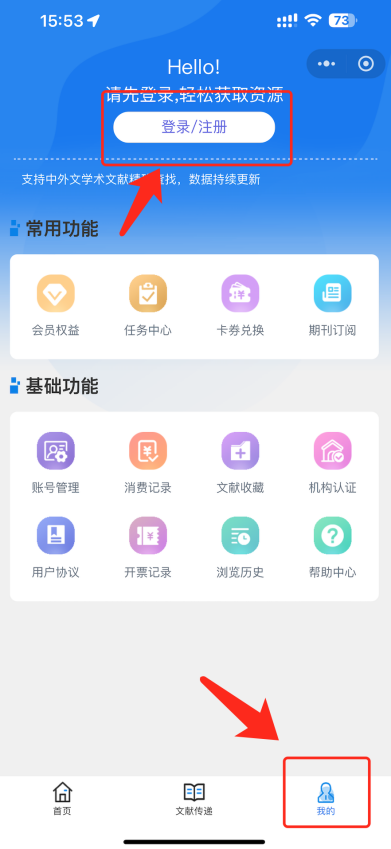 点击顶部「登录/注册」按钮,完善个人信息,填写机构邀请码“5Z4Ee&nG$d”(请完整复制标红部分),绑定所属机构,等待短信通知(人工审核约6小时)